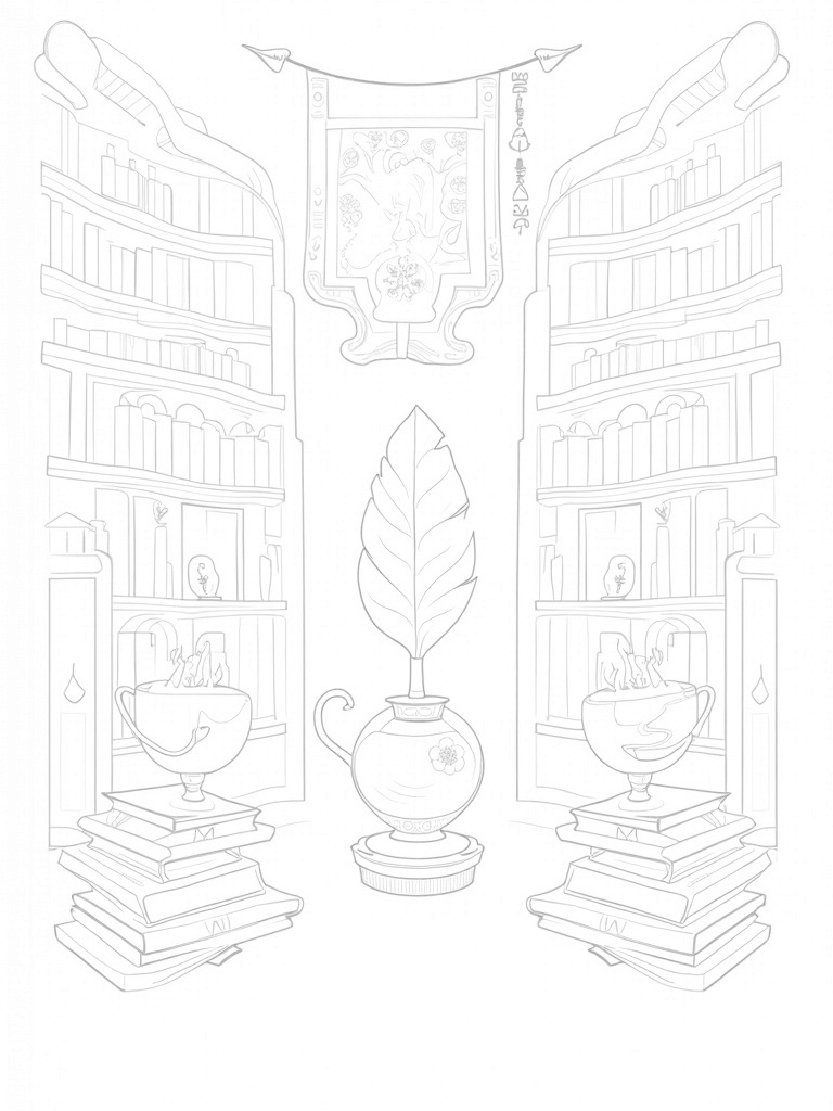 Magical Library with Spellbooks and Quills Coloring Page