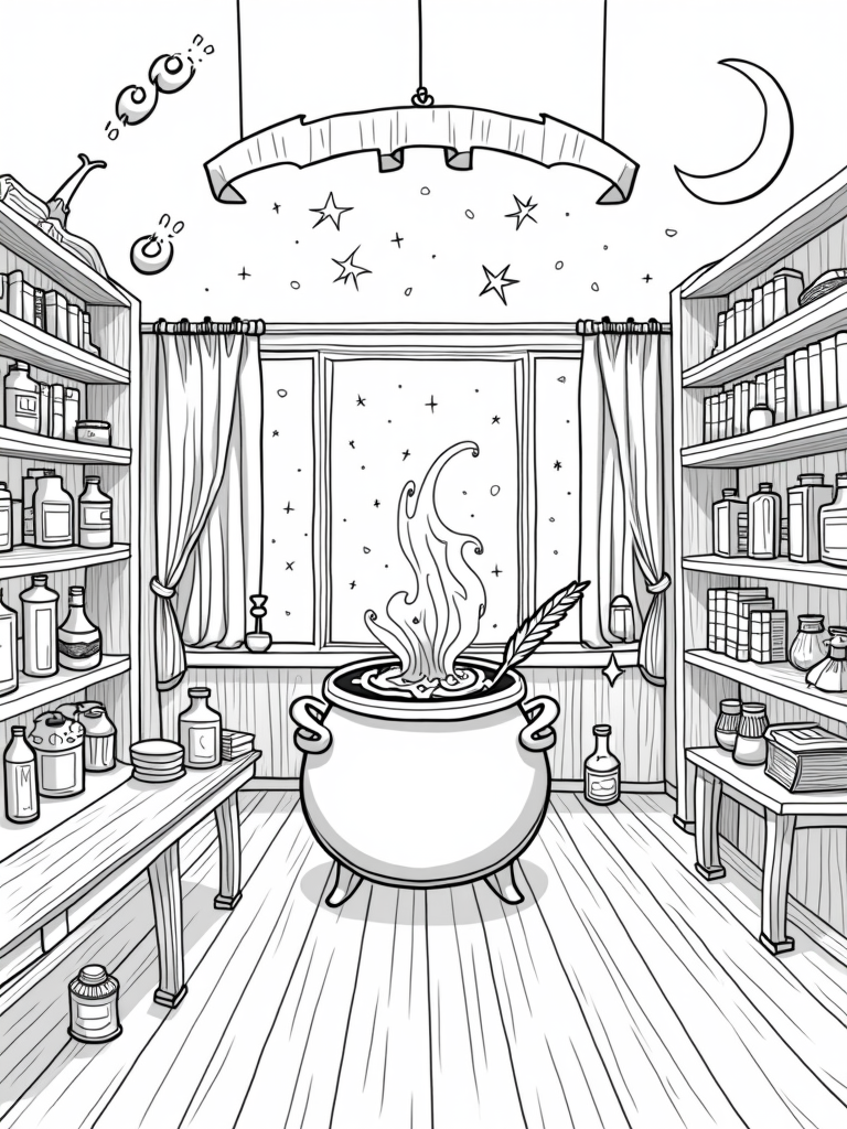 Magical Wizarding Classroom with Cauldron and Potions Coloring Page