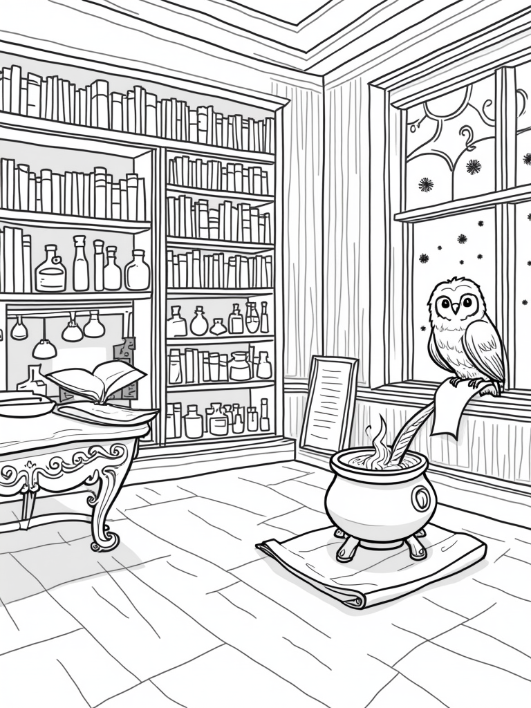 Don’t miss the magical quill that writes by itself on a scroll of parchment—imagine the stories it could tell! And if you look closely, you’ll spot a friendly owl perched on the window sill, watching over the classroom and the twinkling stars outside. This page is perfect for kids who love magic and creativity.