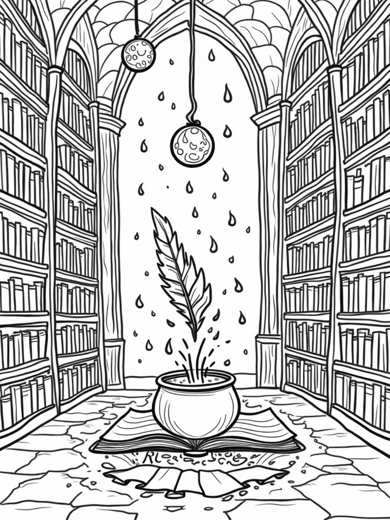 Magical Wizarding Library with Floating Candles and Potion Cauldron Coloring Page