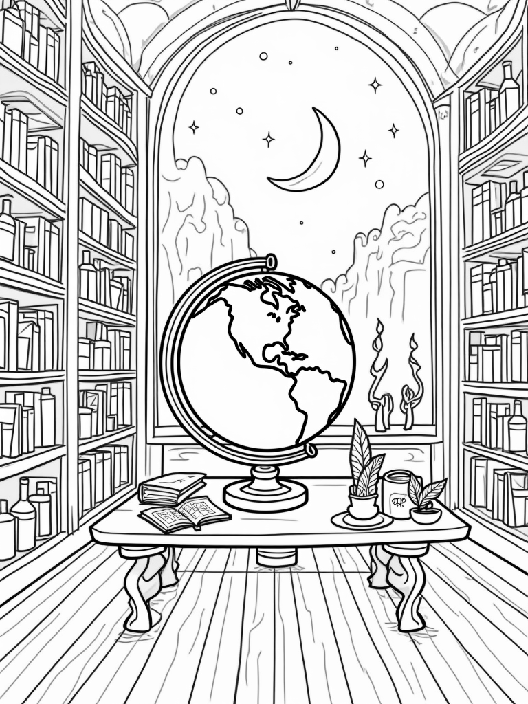 This enchanting library is packed with towering shelves that hold all kinds of spellbooks and potion bottles. Right in the center, there's a large, ornate globe that spins, showing off various magical realms just waiting to be explored. The long wooden table is a treasure trove of quills, parchment, and star charts, perfect for any young wizard or witch eager to write their next spell.