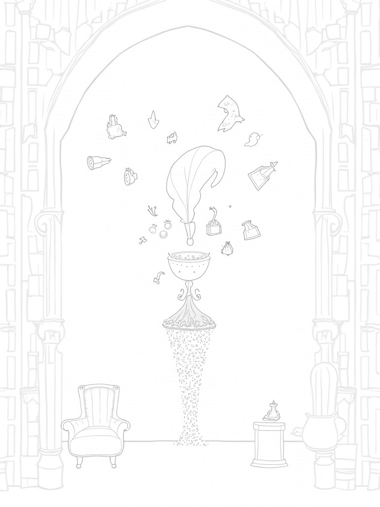 Magical Wizarding Library with Floating Quill and Enchanted Globe Coloring Page
