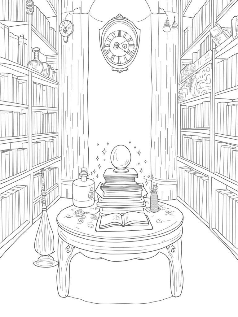 Take a closer look at the broomstick leaning against the wall, which is beautifully entwined with ivy. Above, an enchanted clock with moving gears ticks silently, showcasing a face adorned with mystical symbols. Each element in the library is designed for you to unleash your creativity, so grab your favorite colors and bring this wizarding world to life!