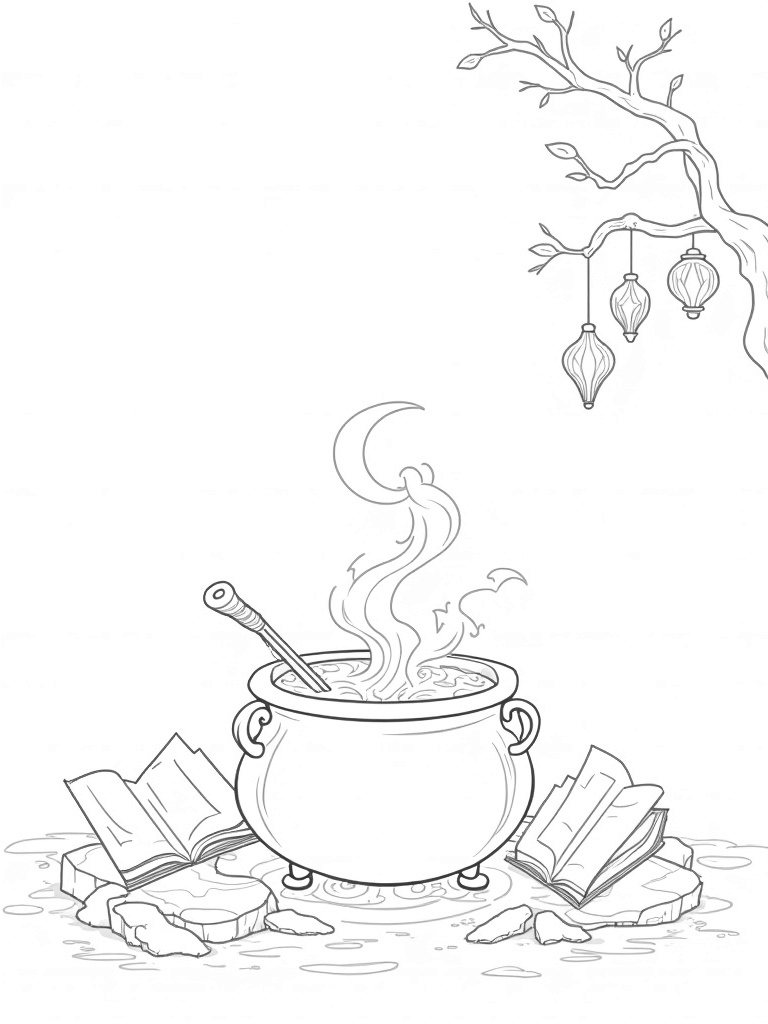 This enchanting scene showcases a bubbling cauldron at the center, filled with iridescent potions that are just begging to be colored. Surrounding it are oversized spell books floating in the air, each one open to reveal glowing spells that spark the imagination. A crescent moon hangs low in the sky, casting a gentle light on an ancient wand resting on a mossy stone, adding a touch of mystery. Nearby, enchanted quills hover with ink swirling like smoke, ready to write magical stories.