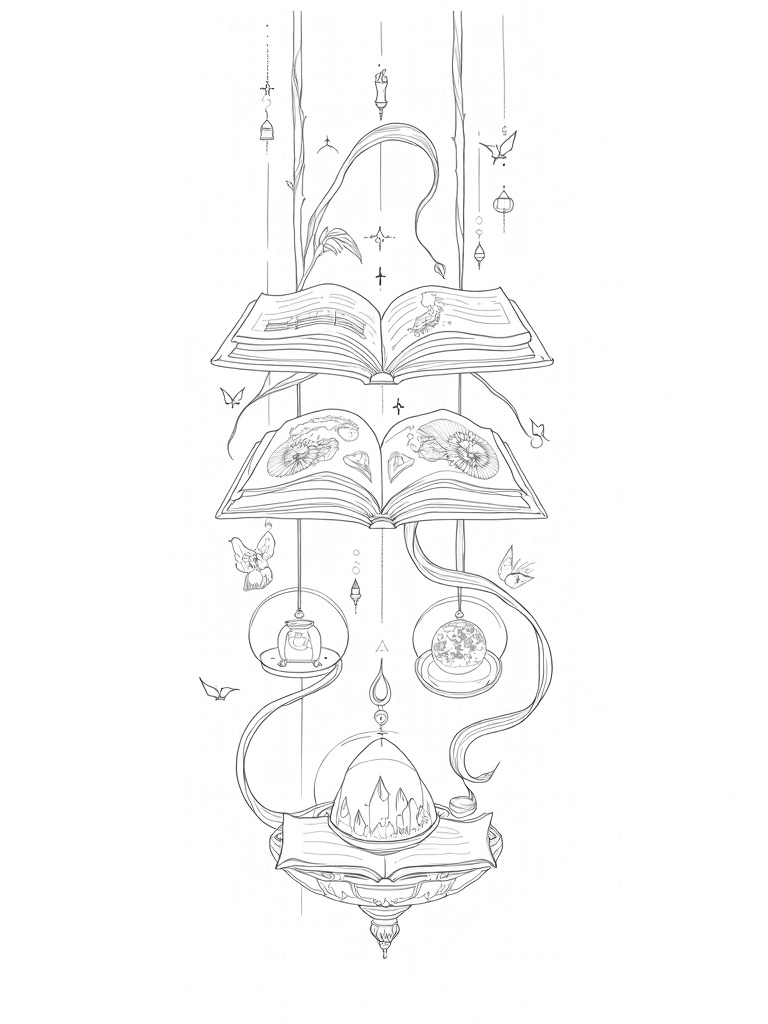 Look closely, and you’ll spot an ornate hourglass, its sand sparkling like stardust as it ticks away time. There's a crystal orb on a pedestal reflecting enchanting landscapes, adding to the magic of this library. Wisps of smoke curl around a quill pen and parchment, hinting at all the secrets waiting to be discovered. Perfect for little wizards and witches!