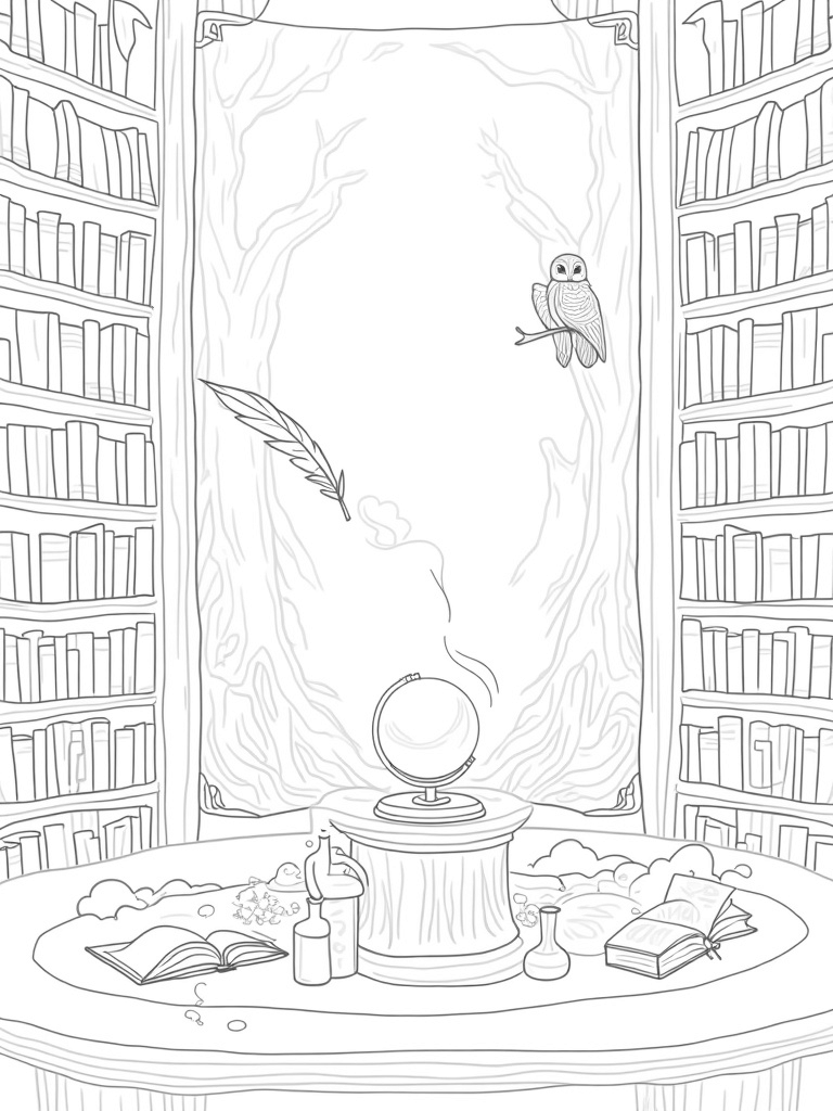 Mystical Library with Floating Quill and Potion Ingredients Coloring Page