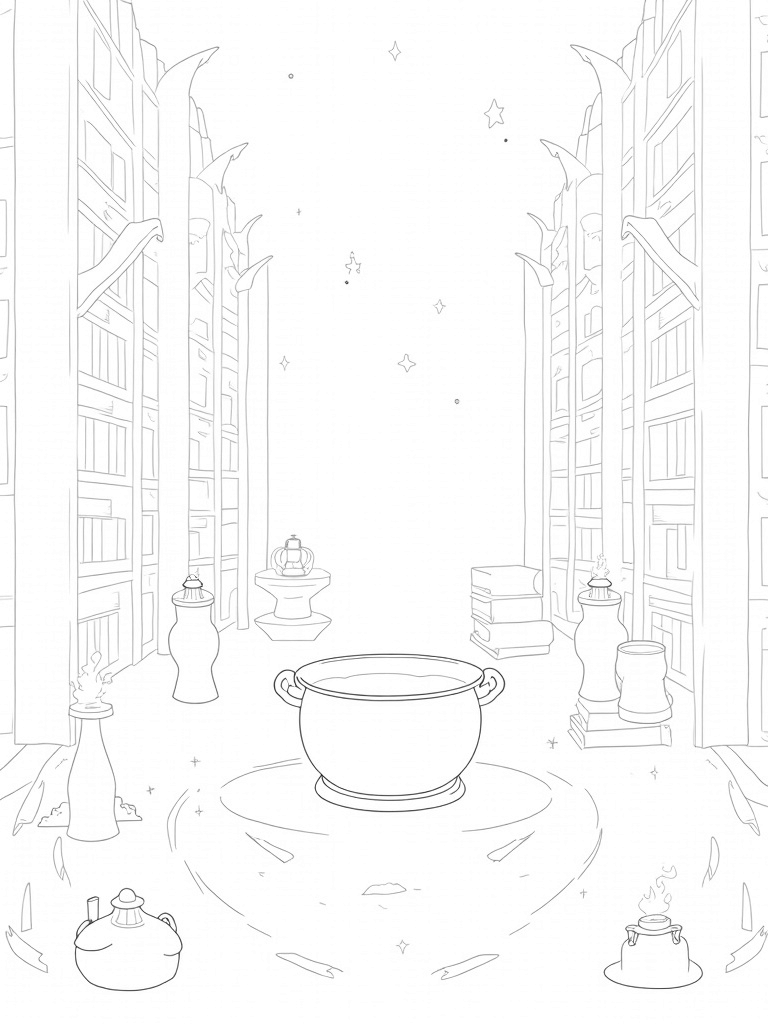 This coloring page takes you to a magical library filled with towering bookshelves that twist like ancient trees. Imagine scrolls and quills floating effortlessly in mid-air, casting playful shadows on the floor. In the center, there’s a bubbling cauldron surrounded by a vibrant array of glowing potion bottles, creating a colorful mosaic that’s just waiting for your artistic touch.
