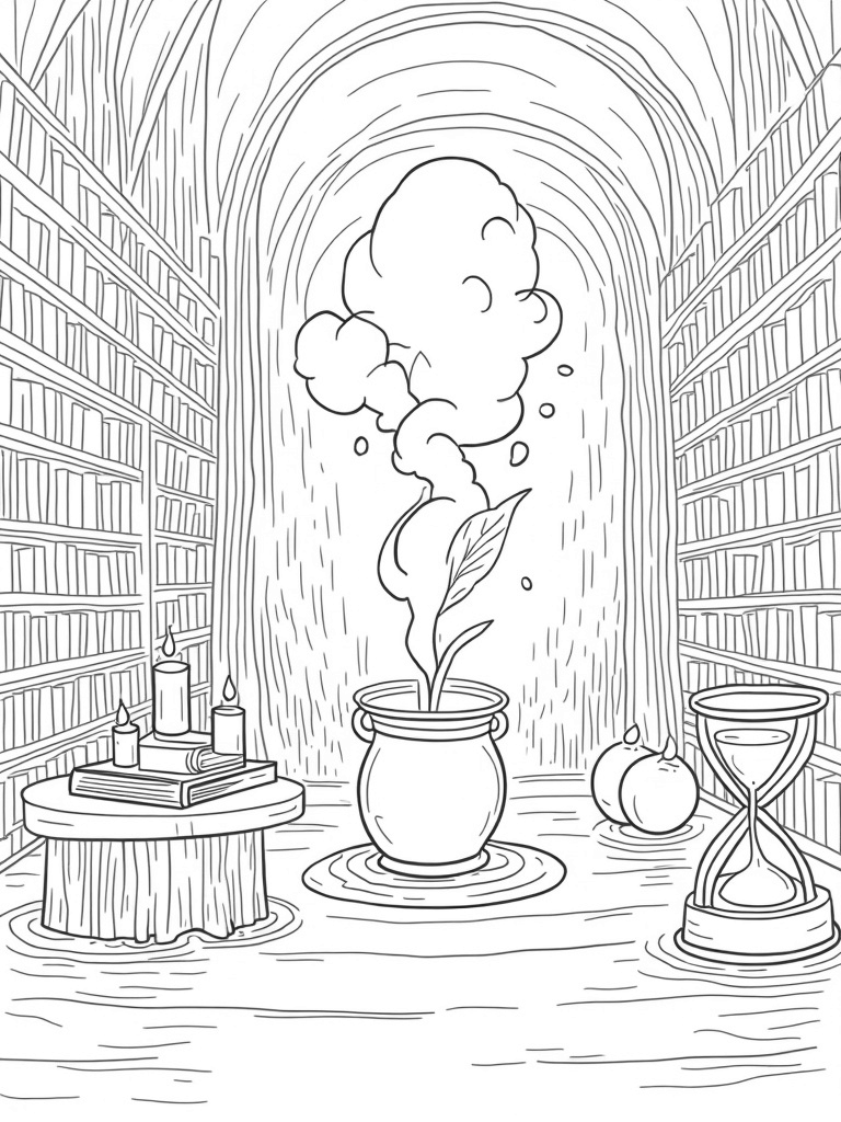 Mystical Library with Floating Tomes and a Bubbling Cauldron Coloring Page