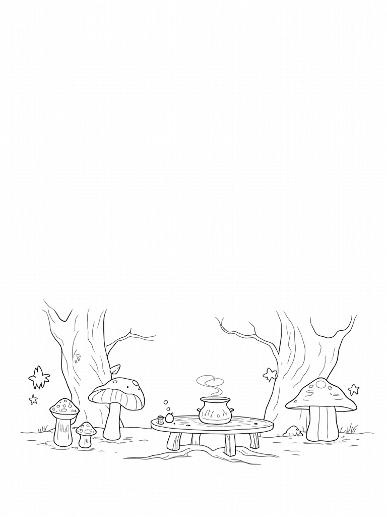 Mystical Potion Lab in a Mushroom Forest Coloring Page