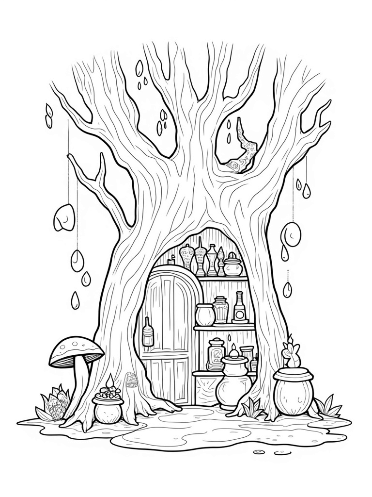 Look up and you’ll see a chandelier made of glowing crystals casting a warm light over everything. Around the base of the tree, oversized mushrooms bloom, their caps forming a cozy spot to sit. Scattered around are parchment scrolls that hint at hidden spells, adding to the enchanting vibe of this potion shop. Can you imagine what kind of potions you might create here?