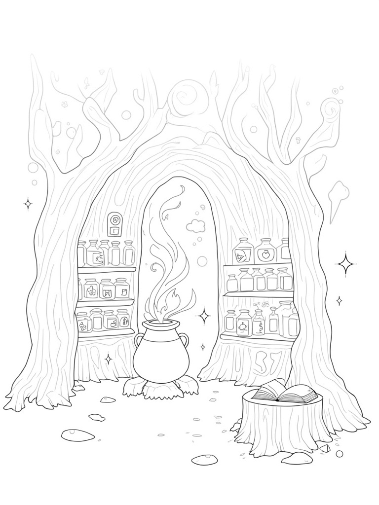 Potion Workshop in a Twisted Tree Trunk Coloring Page