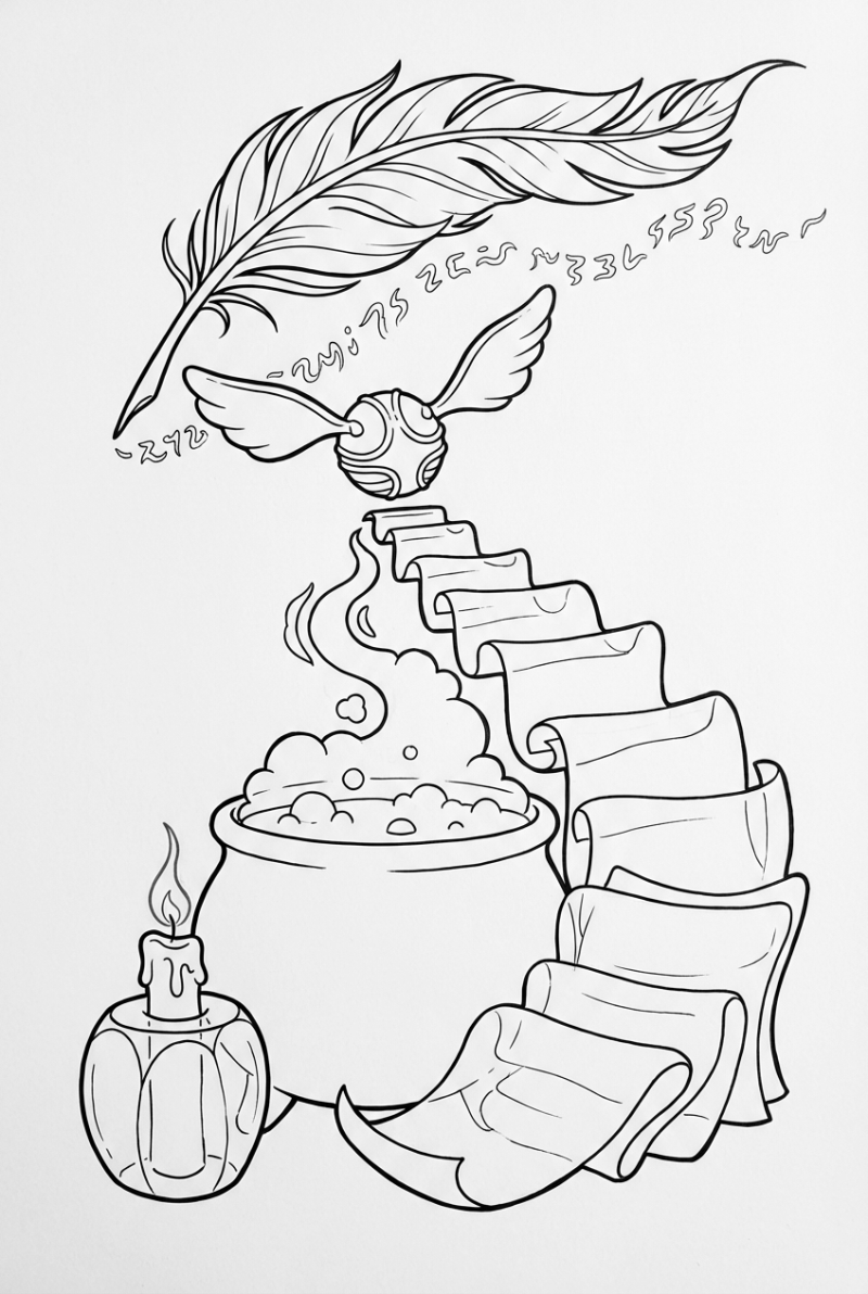 For the cauldron, think deep purples or dark greens for the brew, and a light gray for the metal. The glass steps work great with pastel blues or soft pinks—just keep them light so the translucent feel shows. The Snitch is a classic silver, but kids love adding a hint of gold or rainbow sparkle. The candle’s flame can stay blue or be swapped for a teal or even a gentle orange for a different mood. And those rune trails? Go bold with neon colors like electric yellow or bright magenta to make them pop against the dark sky.