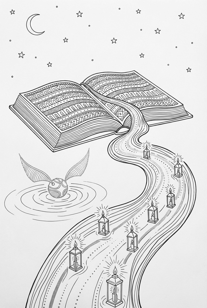 The whole scene is drawn in a Zentangle style, so you’ll find lots of repeating patterns and clean line work that make coloring a soothing puzzle. No solid fills – just the outlines waiting for you to add your own colors. You can make the ink rivers any shade you like, give the snitch a glow, or turn the lanterns into whatever you imagine. It’s a perfect mix of magic and calm for any little wizard who loves to bring drawings to life.