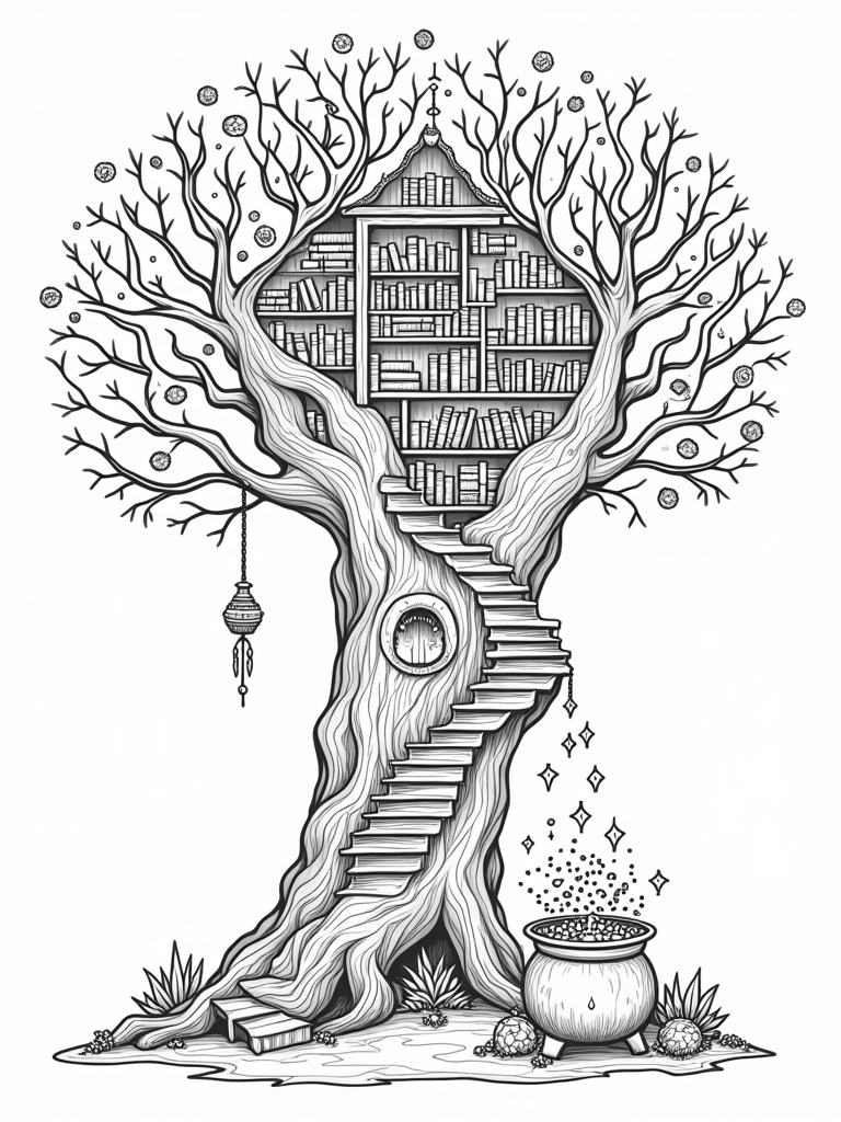At the bottom of the tree, there’s a large cauldron bubbling with colorful potions, ready for some magical potion-making. Scattered around are shimmering crystals and dried herbs, perfect for any aspiring witch or wizard. And don’t forget the spiral staircase that winds up, with floating quills and parchment sheets cascading down like leaves. It’s a creative dream come true!