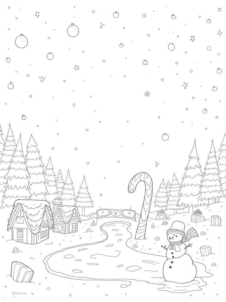 This coloring page shows a magical winter wonderland filled with oversized ornaments hanging from a swirling snowflake sky. Beneath, a giant candy cane curls across a river of hot cocoa, with fluffy marshmallows floating like little islands. You can even spot a cluster of adorable gingerbread houses with gumdrop roofs, nestled among frosted pine trees!