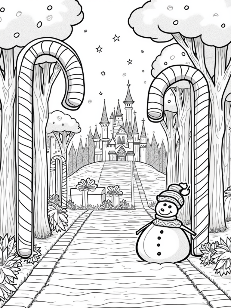 Check out this free, printable coloring page featuring a whimsical holiday forest with giant candy canes, a cheerful snowman, and a gingerbread path. Perfect for getting into the festive spirit and bringing some colorful fun to your day!