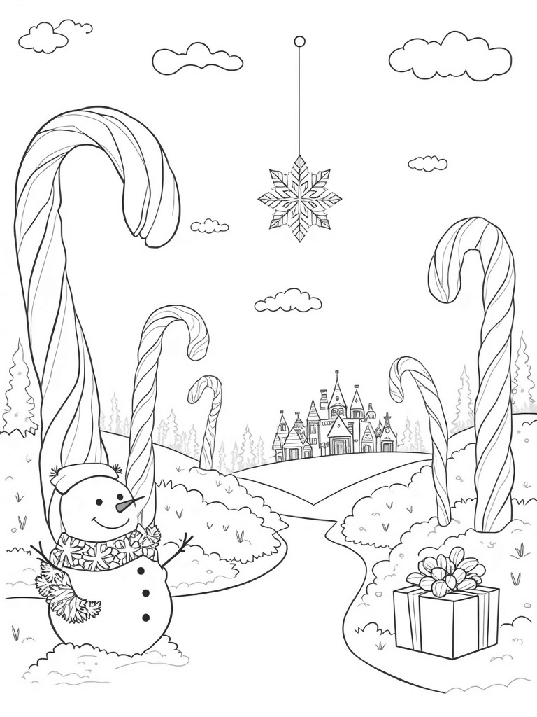 Candy Cane Forest with a Sparkling Snowman Coloring Page