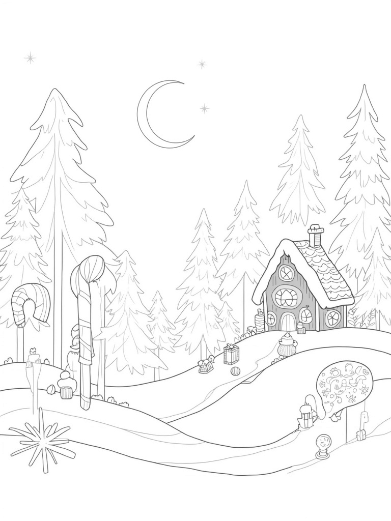 Candy Cane Forest with Gingerbread House Coloring Page