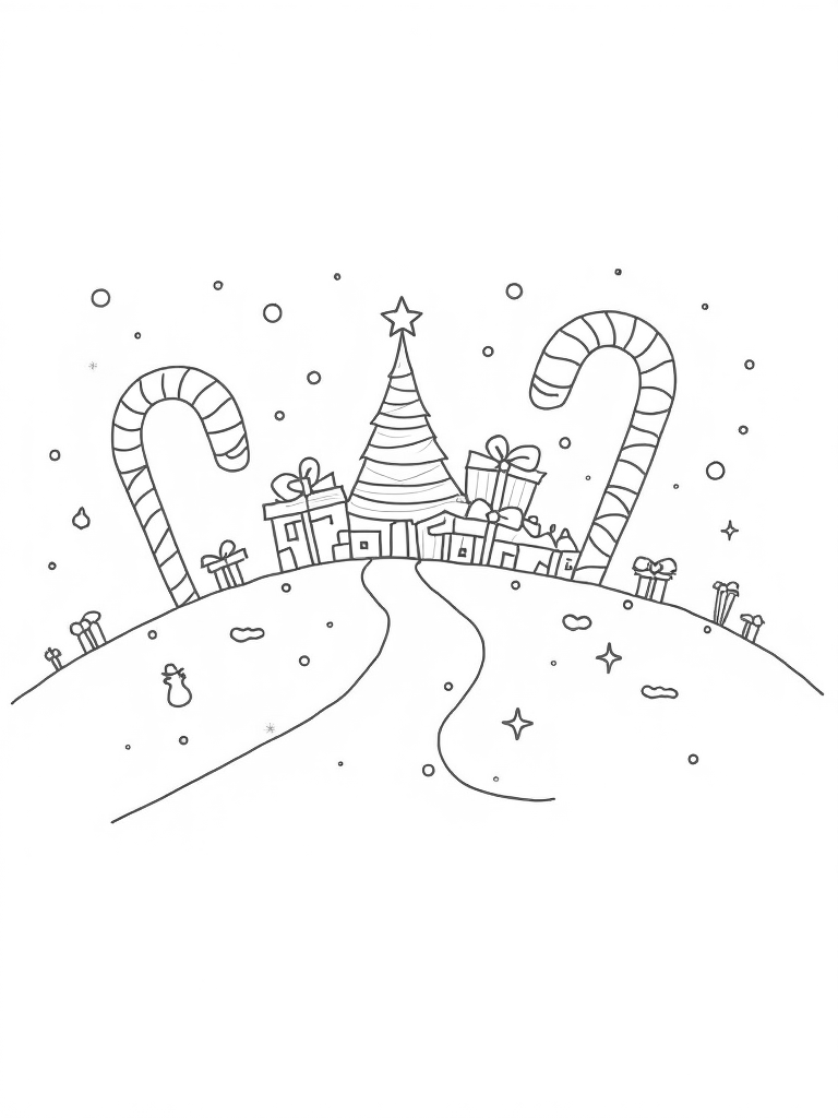 Picture a charming holiday village perched on a snowy hill, where the streets are lined with giant candy canes that twist and turn. Instead of regular buildings, colorful gift boxes are stacked high, each one tied with a shiny ribbon that dances in the winter breeze. Right in the center, a majestic Christmas tree greets you, covered in oversized ornaments that sparkle like stars.