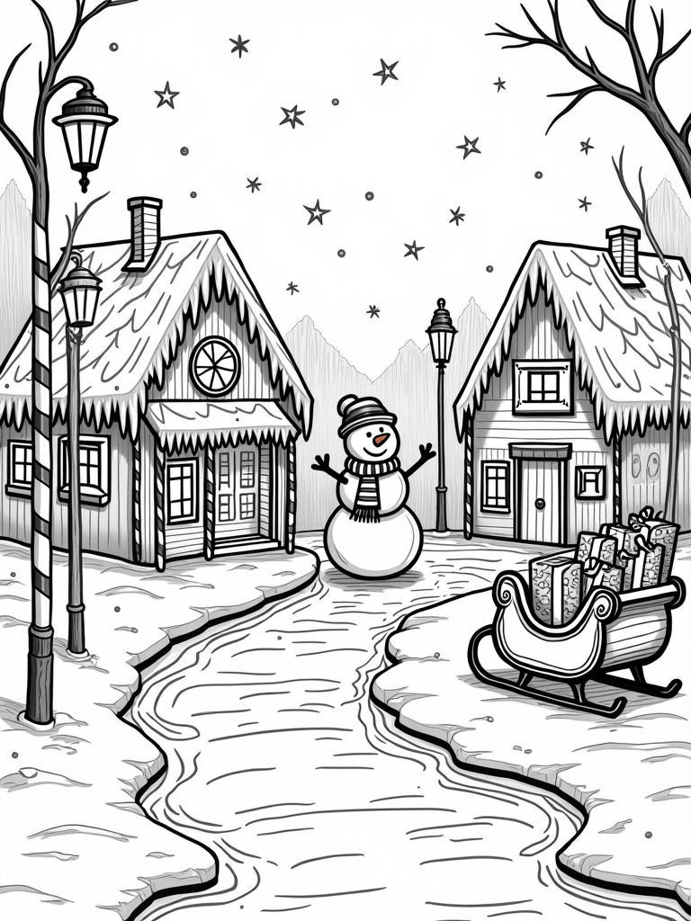 Candy Cane Village with Gingerbread House and Snowman Coloring Page