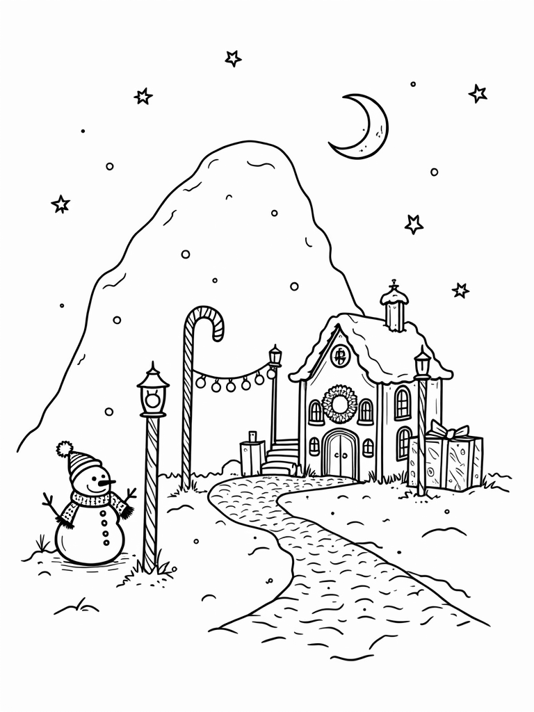 Candy Cane Village with Gingerbread House and Snowman Coloring Page