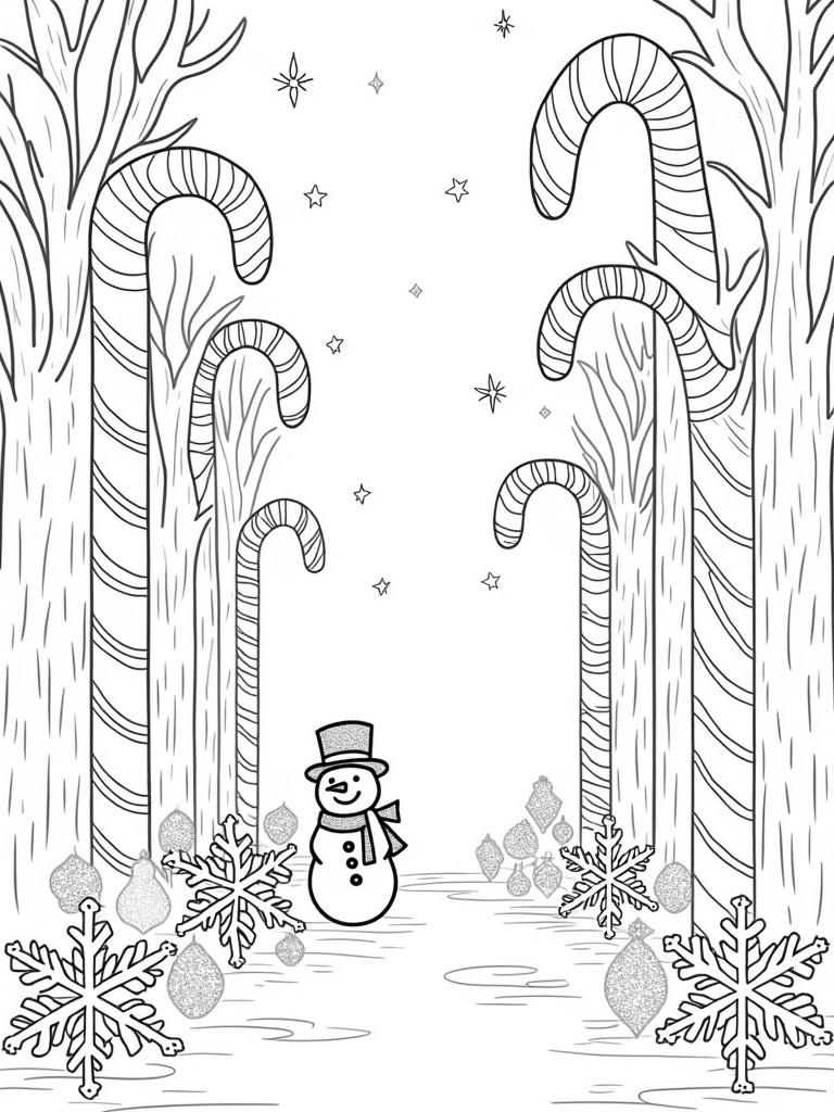 Hanging among the candy canes are oversized ornaments that look like they’re straight out of a holiday dream. These ornaments are bursting with vibrant colors and geometric designs, perfect for adding a splash of fun to your coloring. And let’s not forget the sparkly snowman made of glittering sugar cubes! He's a true winter superstar, complete with a dapper top hat and a cozy scarf, standing proud as frosty stars twinkle above.