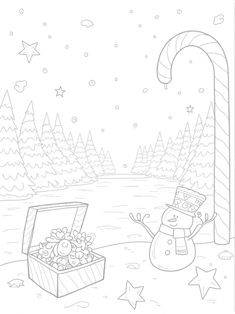 The pine trees in the background are decked out with glowing string lights, creating a cozy holiday vibe. And keep an eye out for the unique snowflakes gently drifting down – each one has its own special pattern for you to color in. Plus, there’s a big gift box right up front, bursting open with shimmering stars and fun holiday trinkets. It’s like a treasure trove just waiting for your artistic flair!