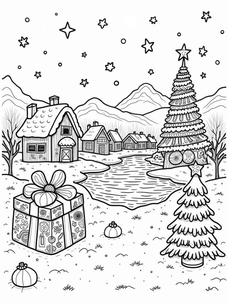 Next to the frozen pond, a tall, spiral Christmas tree glows with colorful lights, adding to the festive cheer. Snowflakes are playfully dancing in the air, making it feel extra special. In the background, snow-capped mountains are dotted with snowmen, each sporting their own unique scarves and hats. And don’t forget to look up at the twinkling stars that seem to twirl above this serene winter wonderland.