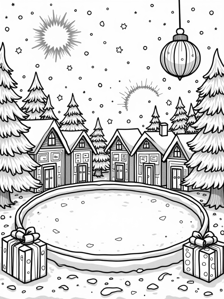 Check out this free, printable coloring page of a winter village! With a beautiful ice rink, twinkling lights, and oversized presents, it’s perfect for the holidays. Kids will love bringing this magical scene to life with their favorite colors.