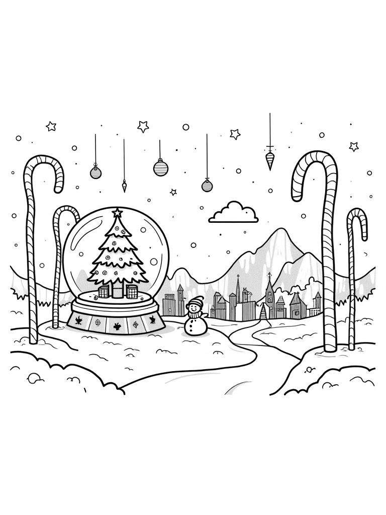 This coloring page showcases a delightful winter village tucked away in a cozy, snow-covered valley. Imagine towering candy cane lampposts lining a meandering path that leads to a central square. Right there, you'll find a giant, sparkling snow globe, inside which a mini evergreen tree twirls gently, surrounded by tiny presents waiting to be opened.