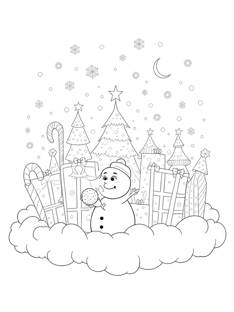 Check out this free, printable coloring page featuring a whimsical holiday marketplace in the clouds! With candy cane stalls, a friendly snowman, and twinkling lights, it's perfect for getting into the holiday spirit. Grab your crayons and let the fun begin!