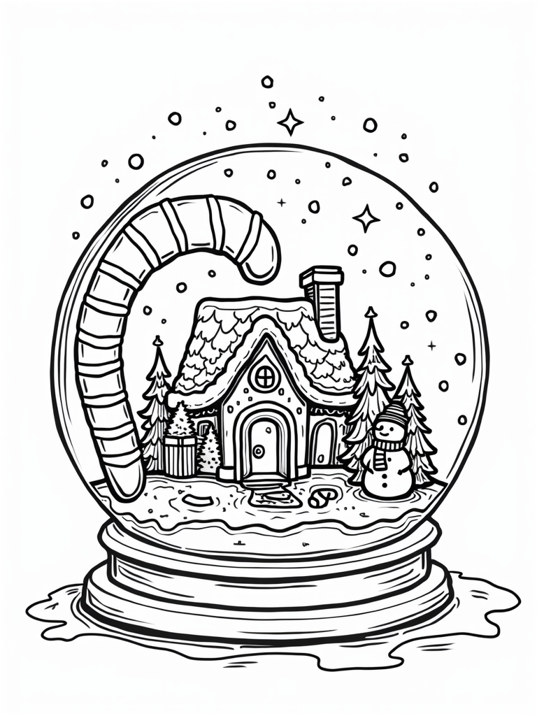 This delightful scene shows a cozy winter village tucked inside a snow globe. At the entrance, a giant candy cane archway welcomes you in. Right at the center is a charming gingerbread house, complete with colorful gumdrop shingles that look almost too sweet to resist!