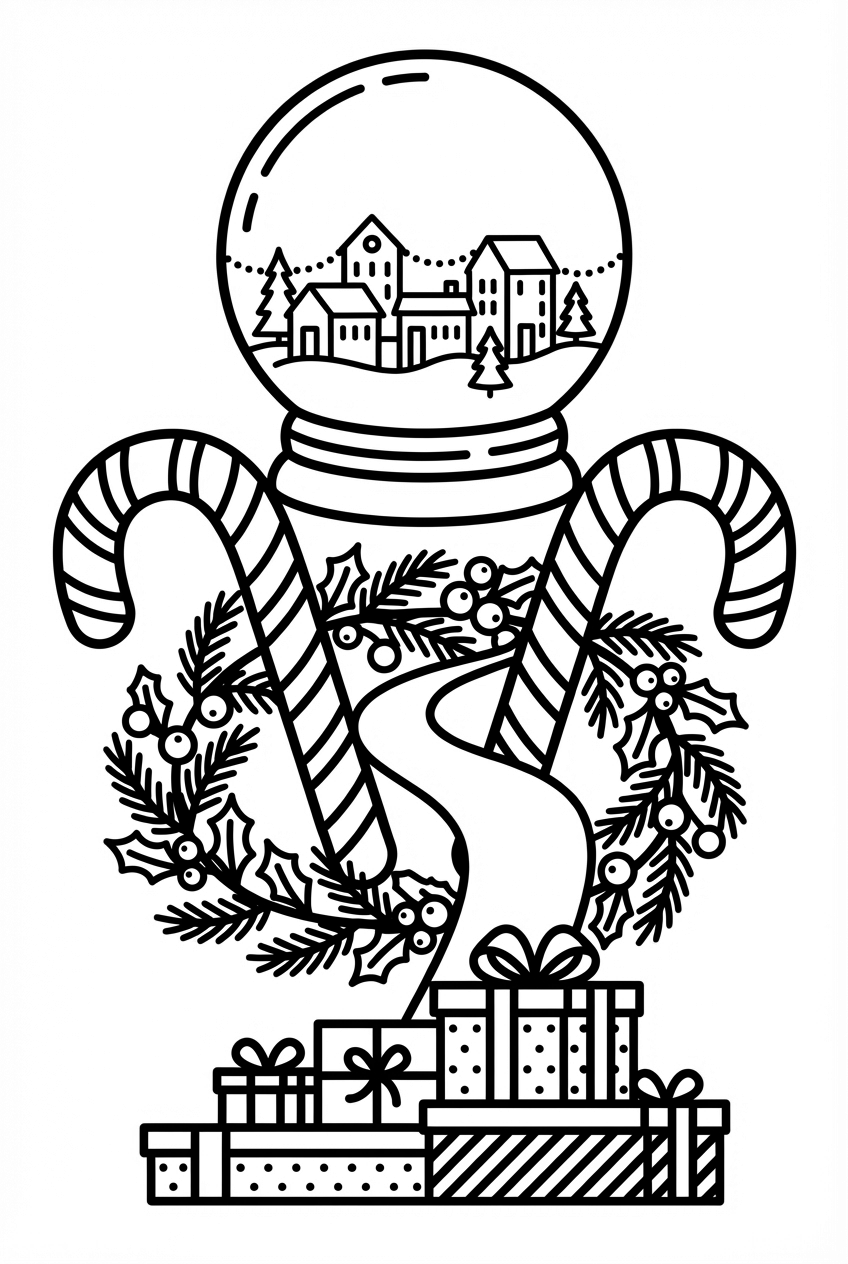 Try using cool blues and whites for the snow globe and plaza, then bring the village lights to life with bright yellows or oranges. The candy‑cane arches pop nicely with classic red and white stripes, while the wreath looks great in greens with red berries. For the gift boxes, have fun mixing patterns – polka dots, stripes, or even sparkle‑like scribbles. Remember, the lines are thick, so you can use chunky crayons or markers without worrying about breaking delicate details.