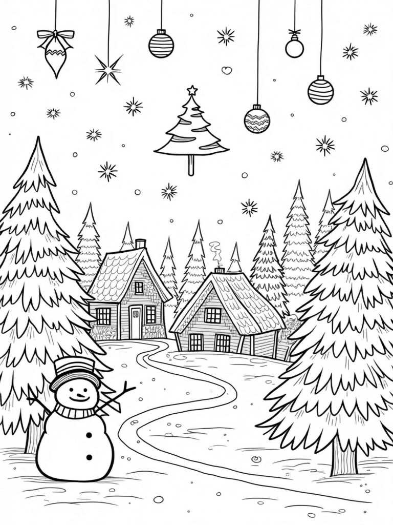Giant Candy Cane Trees and a Snowman in a Winter Wonderland Coloring Page