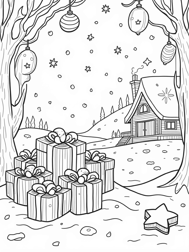 If you look closely in the background, you’ll spot a cozy cabin with a frosted window. The silhouette of the cabin gives off a warm vibe, especially with that little chimney puffing out soft swirls of smoke. It’s the perfect backdrop for a day filled with holiday fun and creativity. Just imagine all the colors you can use to bring this festive wonderland to life!