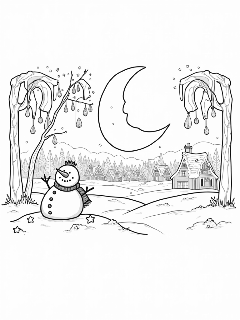 This coloring page brings you a magical winter forest where giant candy canes grow like trees! You’ll find oversized ornaments sparkling in the moonlight, creating a dreamy atmosphere. In the foreground, a friendly snowman, cozy in a holly scarf, sits on a fluffy mound of snow, surrounded by delicious star-shaped cookies. How fun would it be to color each cookie and give that snowman a cheerful personality?