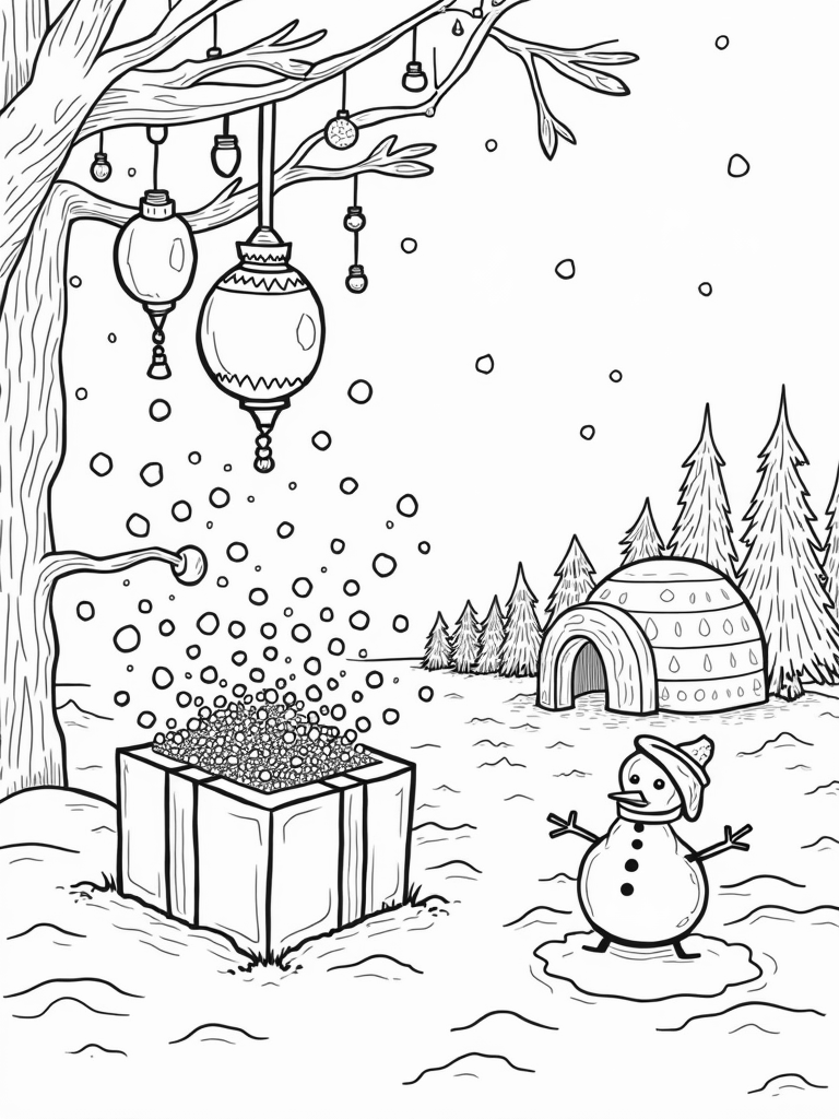This festive scene is bursting with holiday cheer! You’ll spot oversized ornaments hanging from snow-covered branches, sparkling and ready to be colored in your favorite shades. Below them, a giant gift box is wide open, with fairy lights and shimmering ribbons spilling out like a magical surprise.