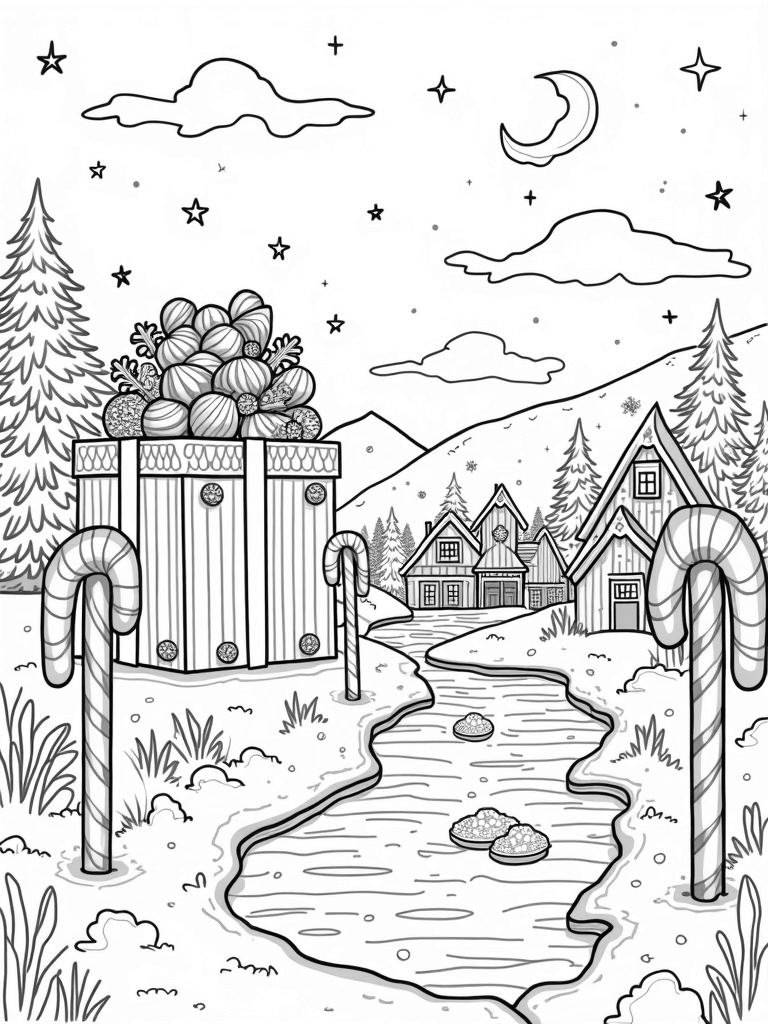 Giant Gift Box in a Candy Cane Winter Wonderland Coloring Page
