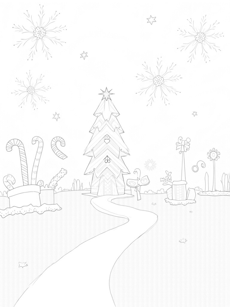 Bring to life this free, printable coloring page featuring a whimsical winter wonderland filled with giant snowflakes, a candy cane Christmas tree, and cheerful gingerbread houses. Perfect for celebrating the holidays, this coloring page is sure to spark joy and creativity!