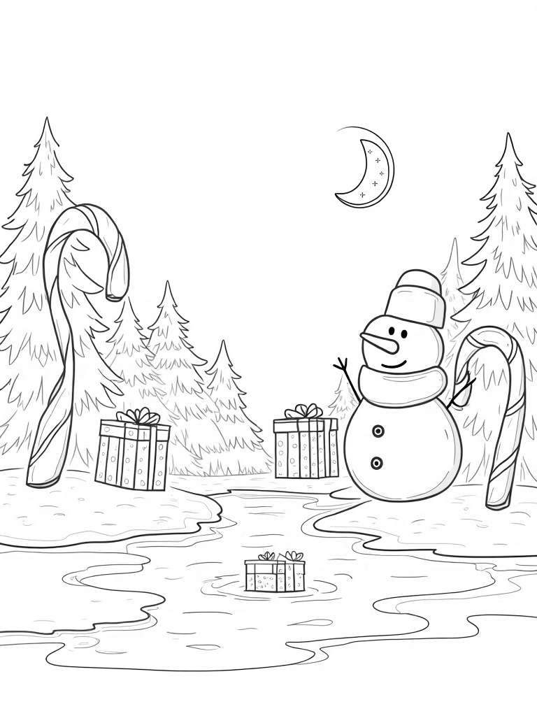 Check out this free, printable coloring page featuring a giant snowman, candy canes, and floating gift boxes! Perfect for the holidays, this whimsical winter scene is sure to spark creativity in kids of all ages.