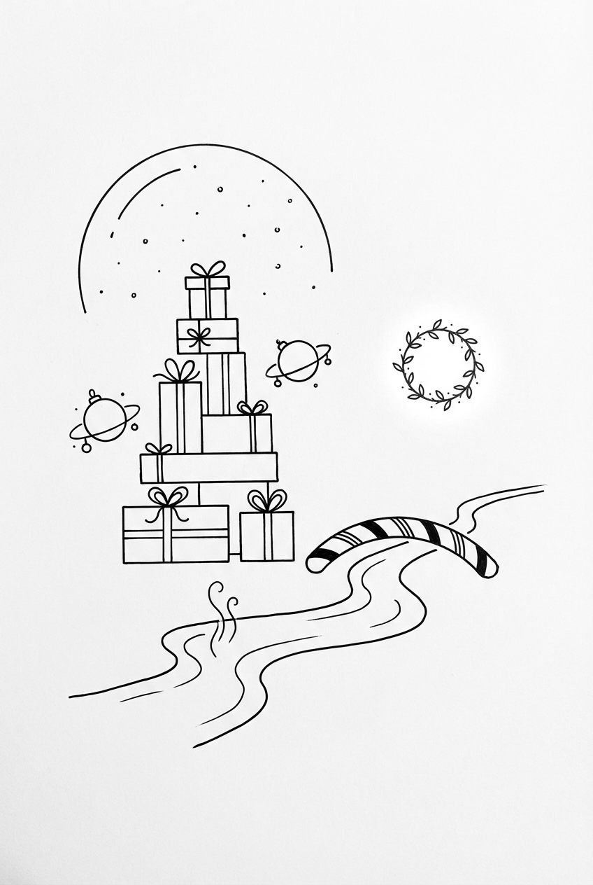 Right in the middle of the page you’ll see a gigantic tree made entirely out of stacked presents, sprouting up from a river of warm, steaming chocolate. Little ornaments float around the branches like tiny moons, and a candy‑cane bridge arches over the chocolate stream, inviting a sweet crossing. Above it all, the sky is a snow‑globe that holds twinkling lights, while a wreath‑shaped moon glows softly in the distance.