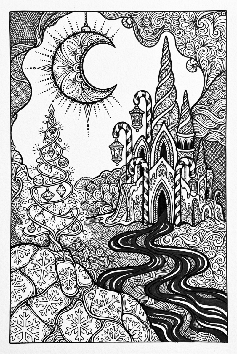 You can go classic and use reds and browns for the cathedral, or mix in blues and purples for an icy twist. The cocoa river is perfect for a shiny silver or a deep chocolate shade. For the pine, think evergreen greens and bright yellow lights. And don’t forget to add some sparkle to the moon and the snowflakes – a bit of glitter pen or metallic crayon can make them pop.