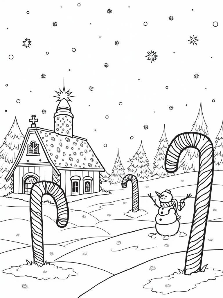 Check out this free, printable coloring page featuring a gingerbread house, giant candy canes, and a friendly snowman. Perfect for holiday fun, this whimsical winter landscape is sure to bring a smile to everyone’s face!
