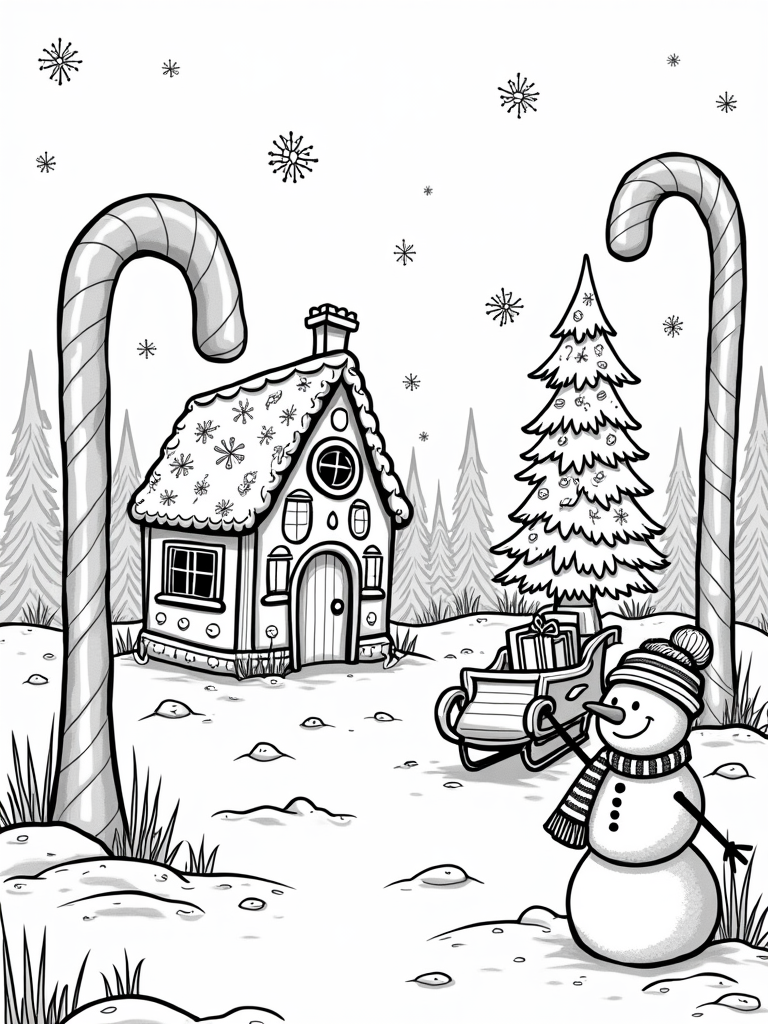 Get ready for some holiday fun with this free, printable coloring page featuring a gingerbread house, candy canes, and a cheerful snowman. Perfect for celebrating the holidays, this coloring page is sure to spark creativity in kids of all ages!