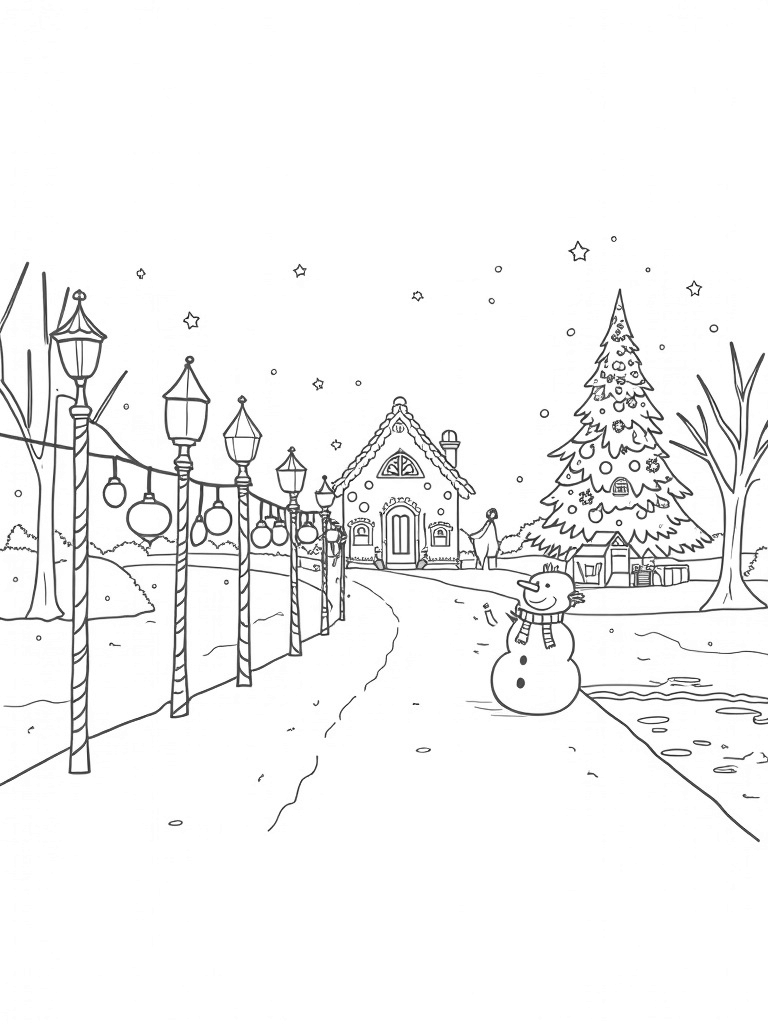 Check out this free, printable coloring page featuring a whimsical winter village with a giant gingerbread house, a cheerful snowman, and a beautiful Christmas tree. Perfect for holiday fun and creativity!