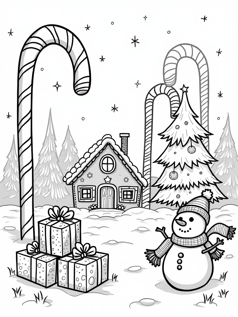 Check out this free, printable coloring page featuring a gingerbread house in a magical candy cane wonderland. Perfect for the holidays, it's a fun way for kids to unleash their creativity with this delightful scene!