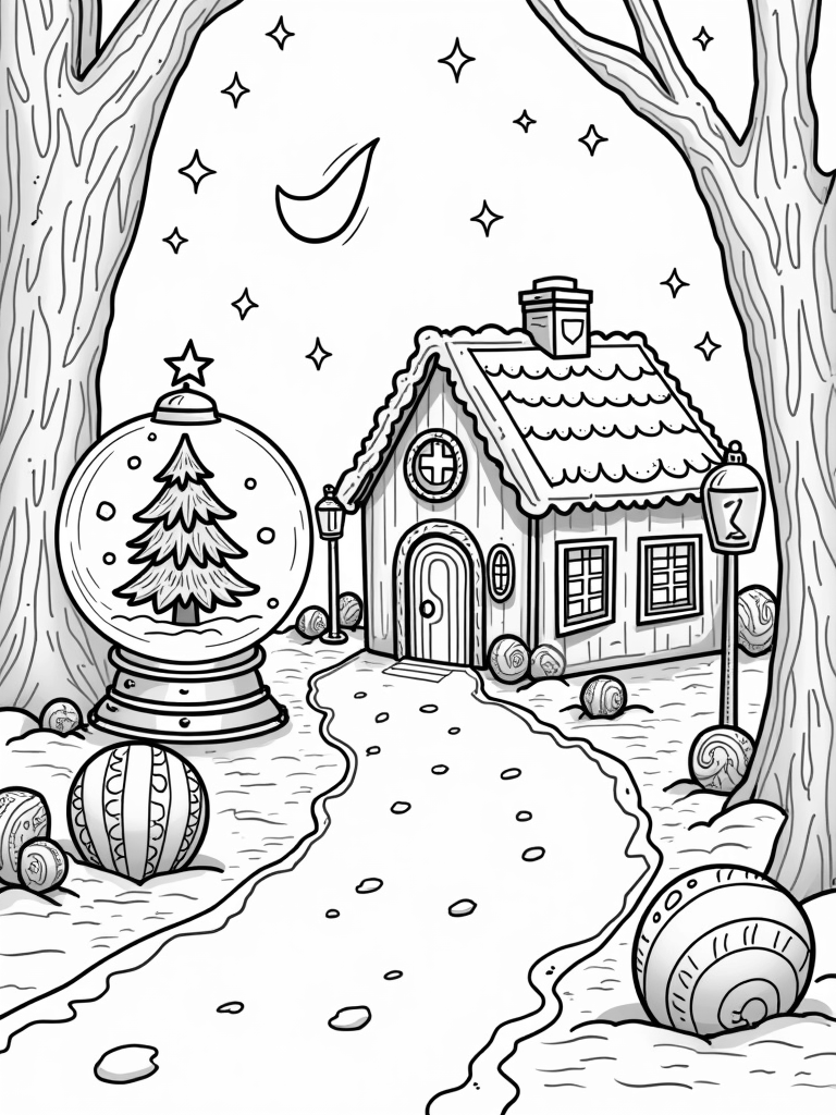 In the foreground, oversized ornaments dangle from an invisible tree branch, each one covered in intricate patterns just waiting for your creativity to bring them to life. And if you look up, a crescent moon shines brightly, adorned with a garland of twinkling stars that adds a magical touch to the whole scene. It's a delightful winter wonderland perfect for getting into the holiday spirit!