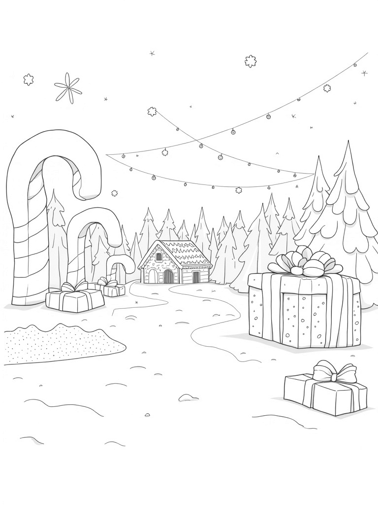 There’s so much to color in this delightful village! You can choose bright reds and greens for the candy canes or go wild with the colors of the lollipops on the gingerbread house. Don’t forget to add some twinkling colors to the holiday lights draped overhead. And that big present in the foreground? It’s just waiting for your artistic touch to bring it to life!