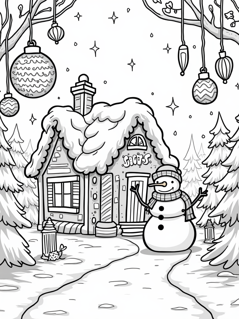 Get ready to color in this free, printable winter wonderland scene! Featuring a giant gingerbread house, a cheerful snowman, and oversized ornaments, this coloring page is perfect for the holidays. Let your creativity shine as you bring this festive picture to life!
