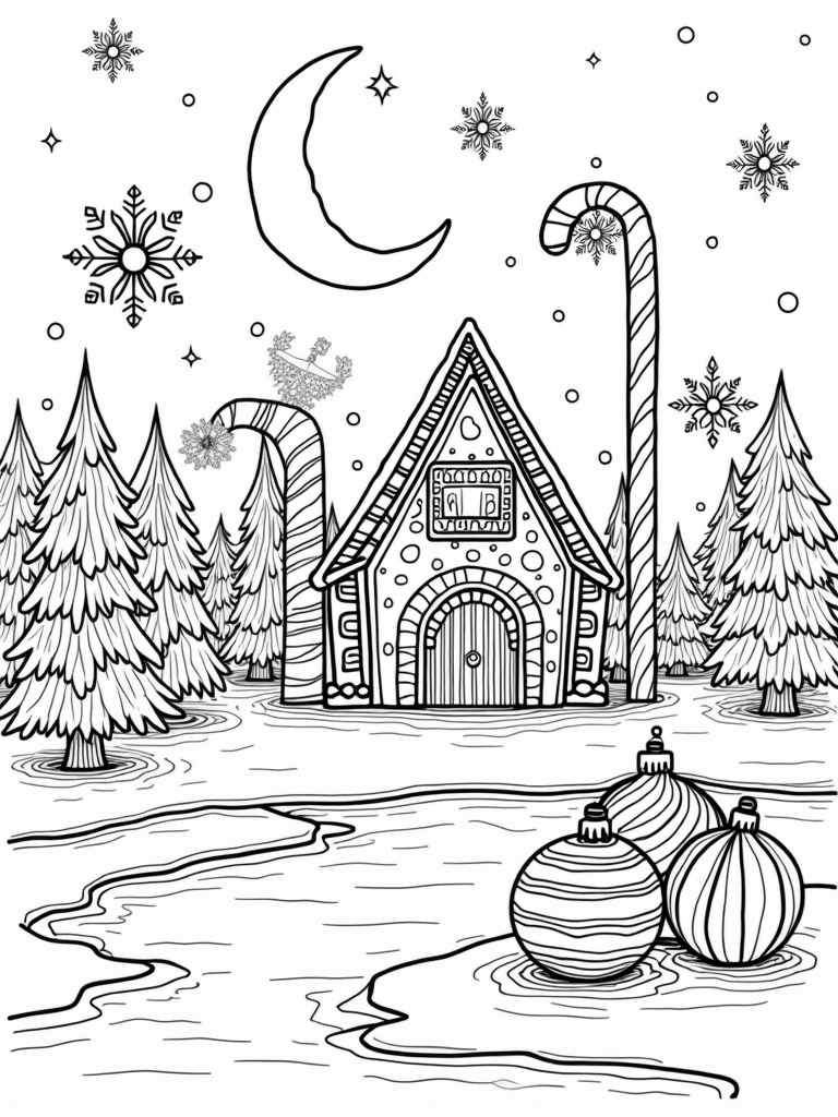 Check out this free, printable coloring page featuring a giant gingerbread house in a winter wonderland! With swirling snowflakes and a sparkling pond, it's perfect for holiday fun and creativity.